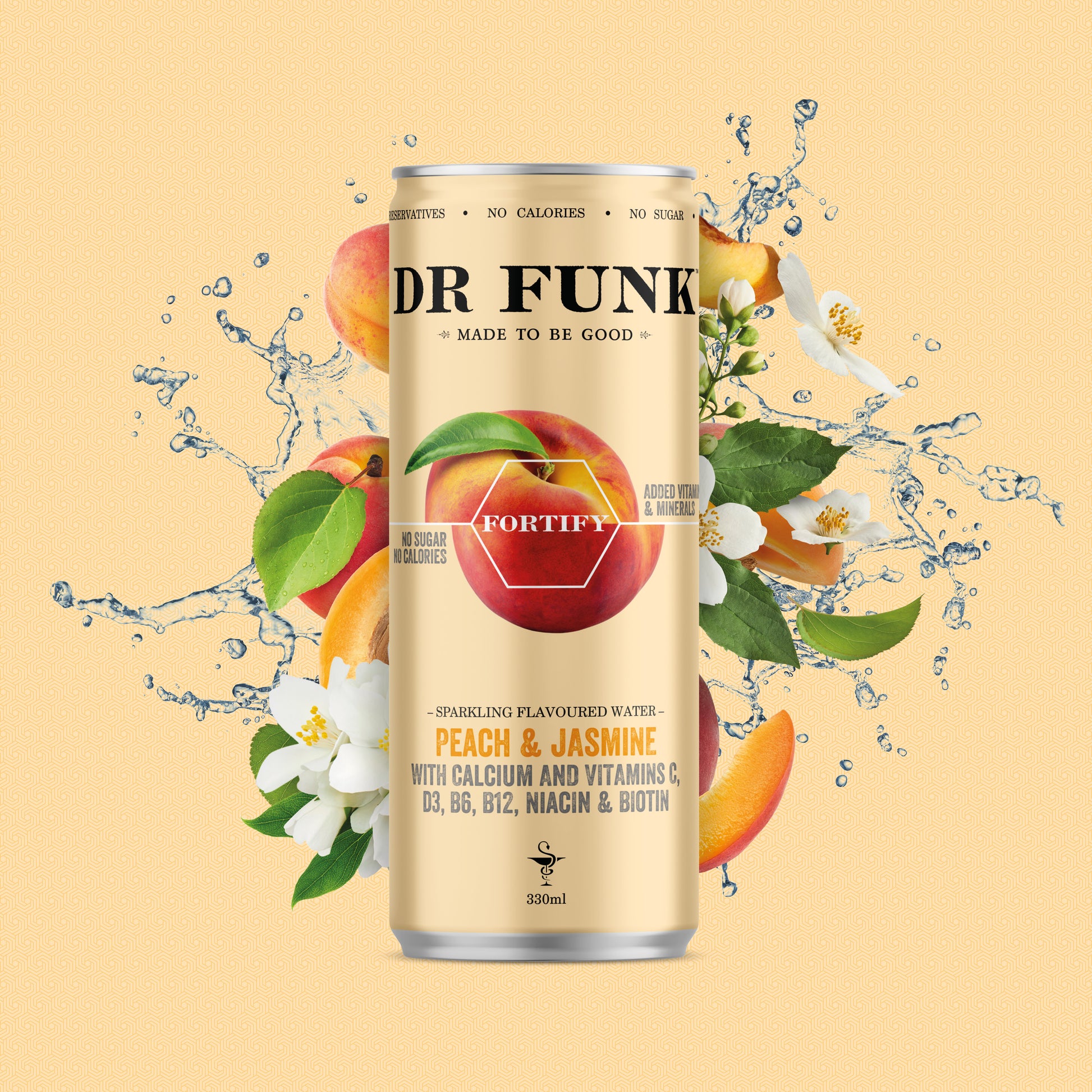 Dr Funk Fortify Edition combines natural peach and jasmine flavours with 7 added essential nutrients including calcium to create a drink that's made to be good.