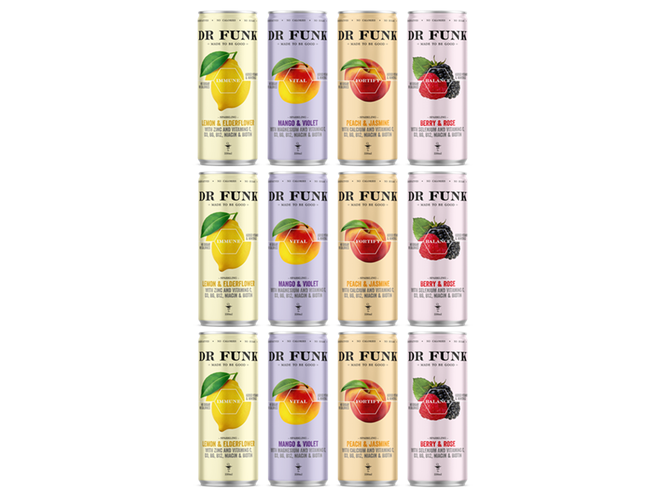 Not sure which flavour you prefer? Try the Dr Funk mixed pack. Our 4 pack has one can of each flavour; lemon & elderflower, mango & violet, berry & rose and peach & jasmine. Each can contains 7 essential nutrients, no allergens or anything nasty. No marketing fluff, just good stuff. Perfect to give Dr Funk a try.